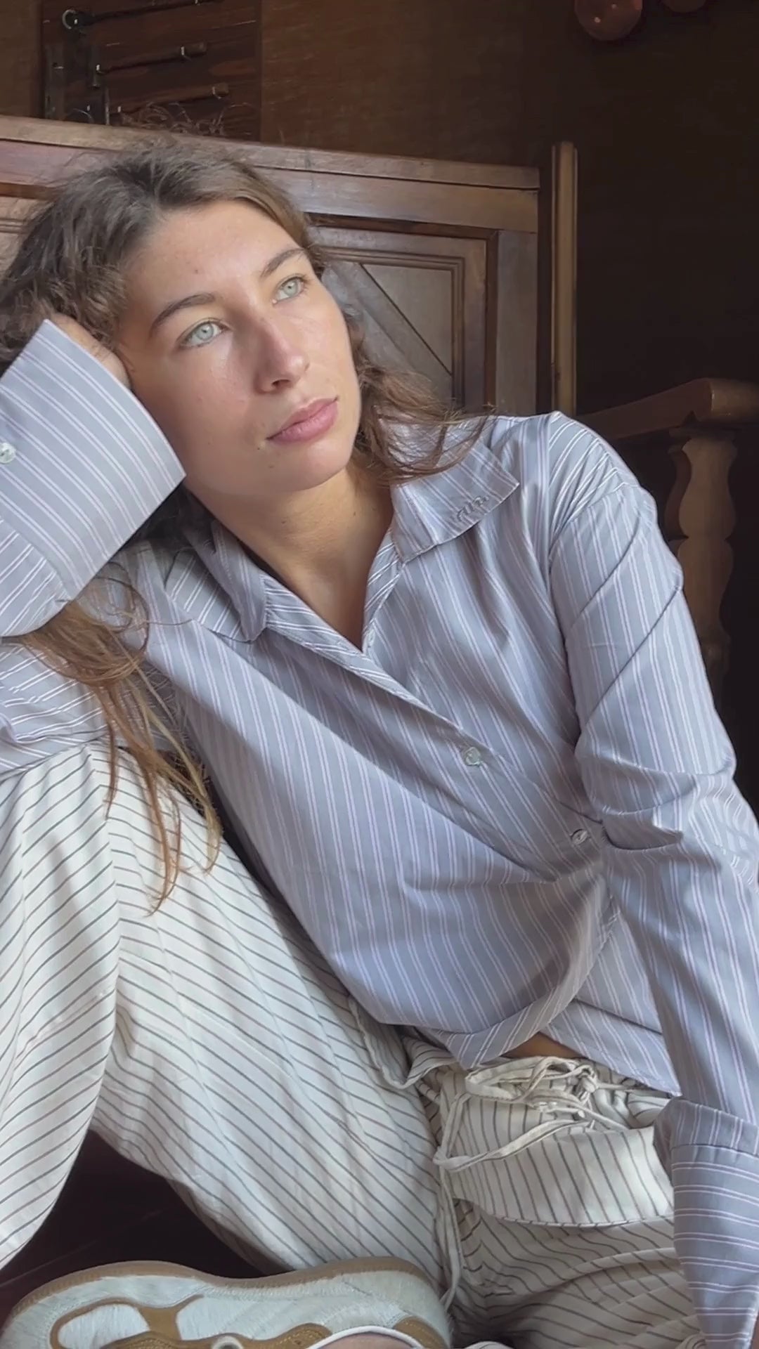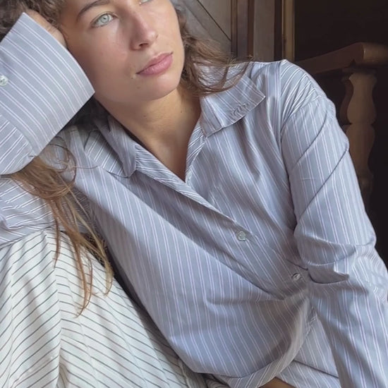 Descripción: Camisa de rayas de diferentes tonos: gris, marrón y beige. Diseño cruzado y fluido, con lazos ajustables en el interior y exterior para llevarla de diferentes maneras. Detalle en las mangas y ligero ajuste en la espalda.